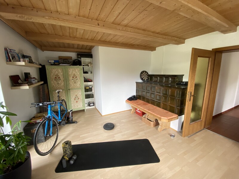 Die Räume mit teilweiser -geringfügiger- Dachschräge habe den bestimmten Flair. Zumal das sehr großzügige Wohnzimmer mit einem urgemütlichen Kachelofen und einer traumhaften Holzdecke besticht.
